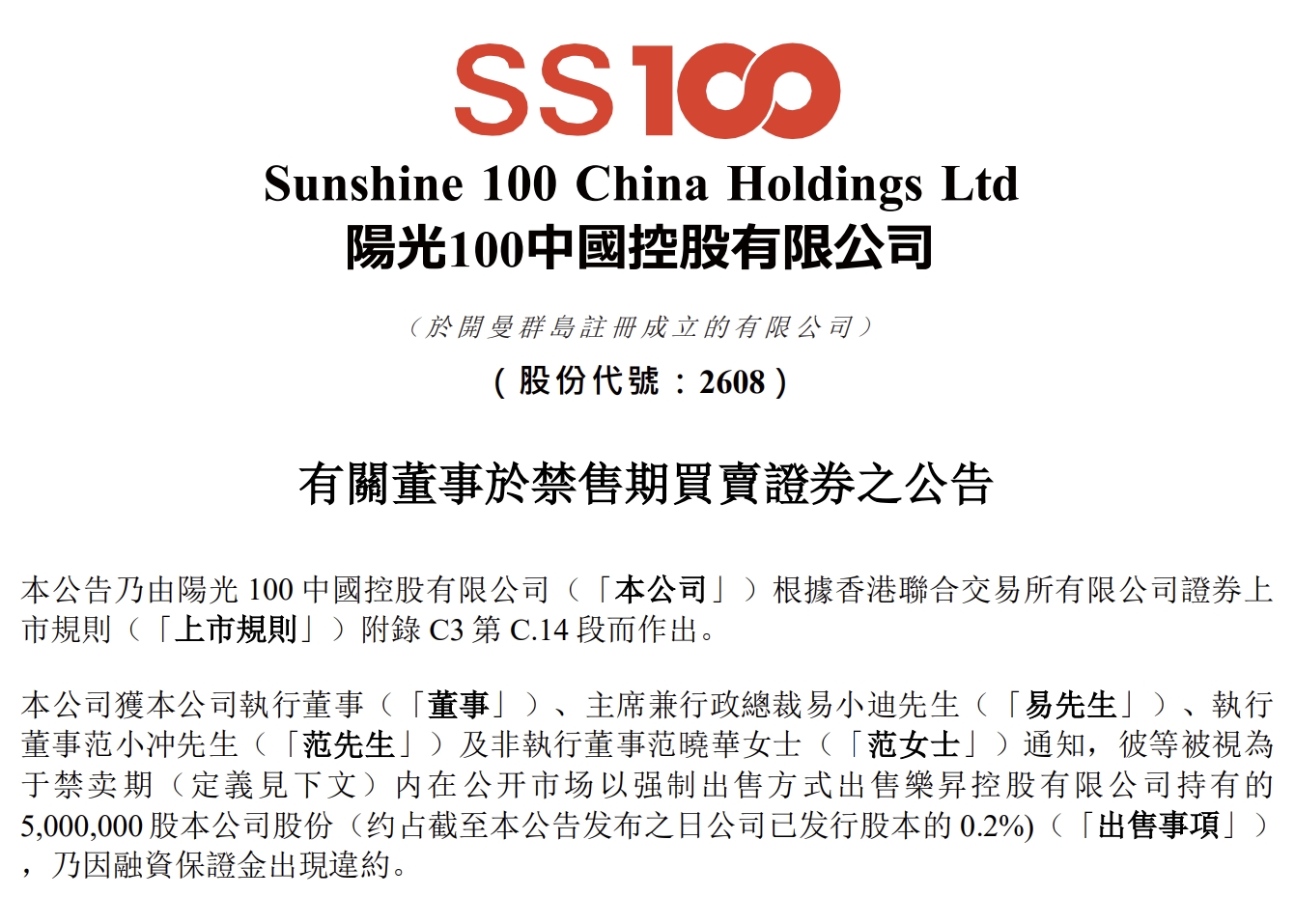 新京报贝壳财经讯(记者袁秀丽)2月3日,阳光100中国在港交所发布董事于禁售期买卖证券的公告。