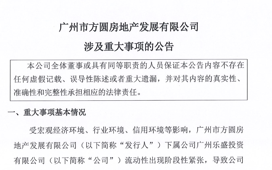 公告称,受宏观经济环境、行业环境、信用环境等影响,方圆地产下属公司广州市方圆乐博实业投资有限公司、广州市方圆乐扬实业投资有限公司、广州市方圆乐恒实业投资有限公司流动性出现阶段性紧张,导致公司出现部分债务未能如期偿还的情况,目前公司正与上述涉及的相关金融机构积极协调解决方案。截至4月1日,上述三家公司合计未能清偿到期有息债务本金余额为1050万元。