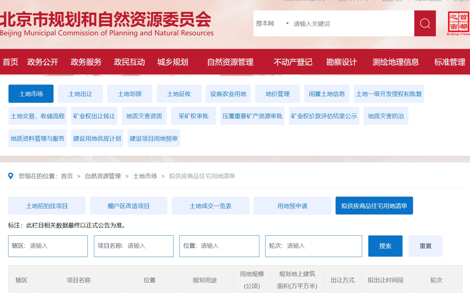 北京市规划和自然资源委员会官网截图